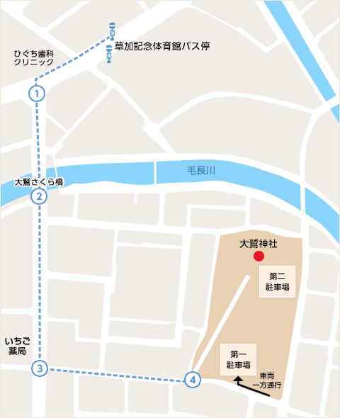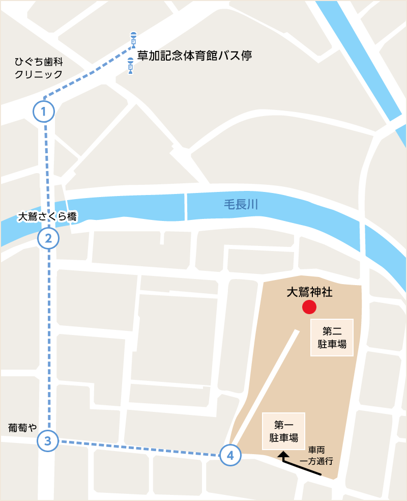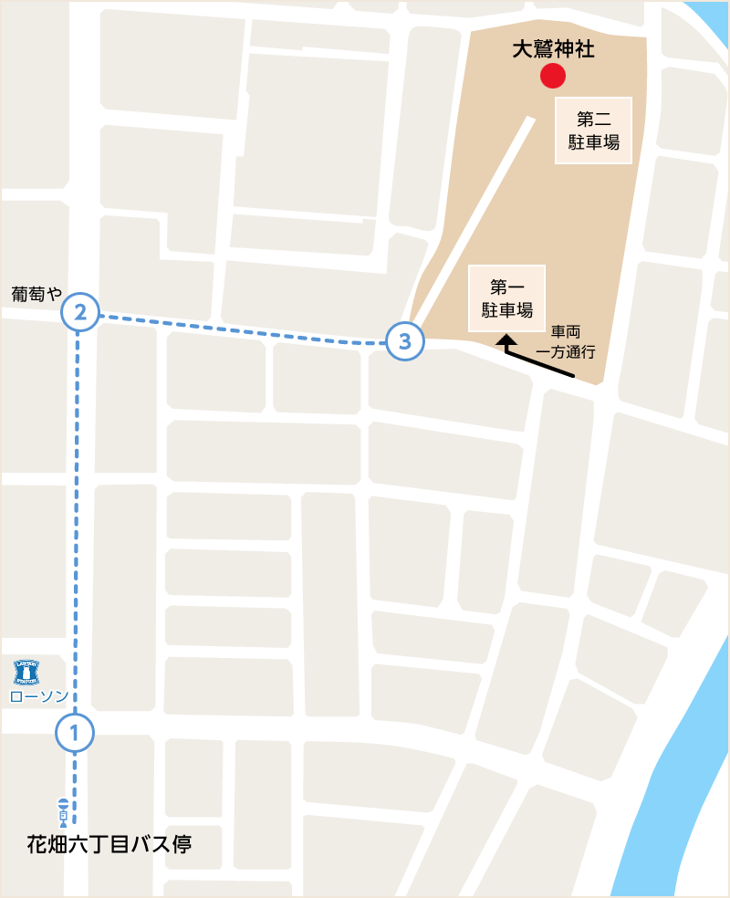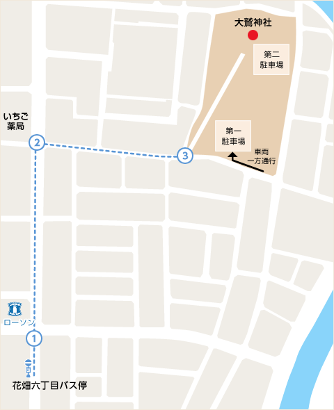 神社の南側の道路は一方通行のため、第一駐車場からは右折しかできません。ご注意下さい。