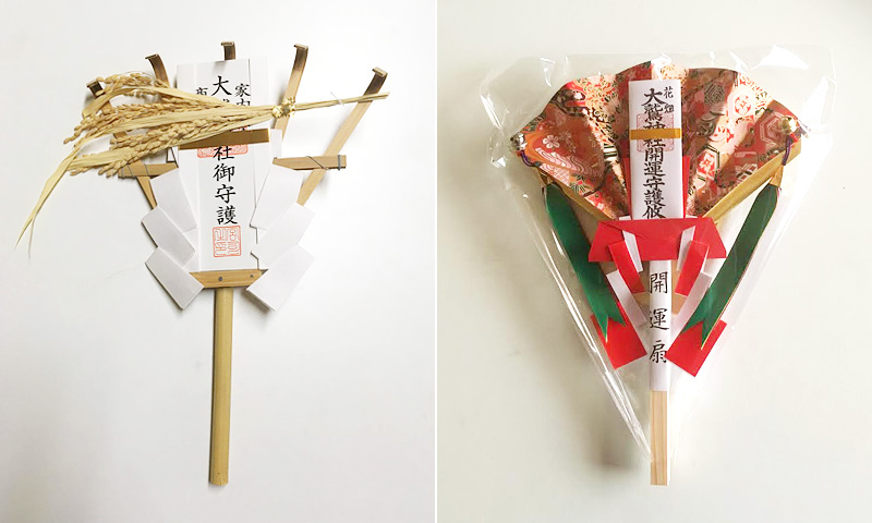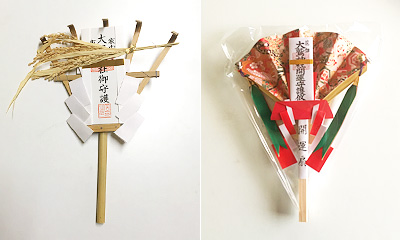 いつの頃からか熊手にお札と稲穂が付いている「かっこめ」が頒布されるようなります。形の由来はいくつかありますが、運を掻き込むように熊手の形をしているとか、社名になぞらえて幸運を鷲掴みにするとして鷲の足が元になっているとも言われます。